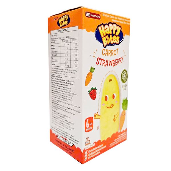 - Bánh gạo Happy Bites cà rốt dâu 21g được nướng ở lò thay vì chiên qua dầu, không chứa chất bảo quản và chất tạo màu, mẹ an tâm khi cho bé sử dụng.