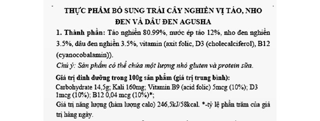 - Trái cây nghiền Agusha táo, nho đen, và dâu đen túi 80g chứa vitamin B9, D3, B12, hỗ trợ cơ thể hấp thụ canxi, củng cố hệ xương và răng chắc khỏe, đồng thời tăng cường khả năng miễn dịch cho bé.