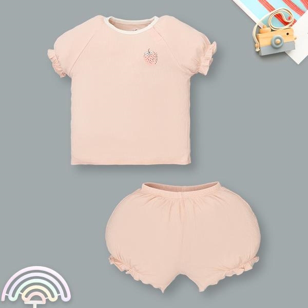 - Thiết kế bộ đồ mang phong cách nữ tính với áo cổ tròn, cúc mở vai tiện lợi giúp mẹ dễ dàng thay mặc cho bé không bị vướng víu. Phần tay áo và viền quần được may bèo nhún nhẹ, tạo độ bồng bềnh mềm mại, kết hợp họa tiết trái dâu nhỏ xinh ở ngực áo làm điểm nhấn tinh tế. Kiểu dáng bộ tay ngắn rộng rãi, không ôm sát cơ thể, giúp bé vận động thoải mái mà không lo bí nóng hay khó chịu.