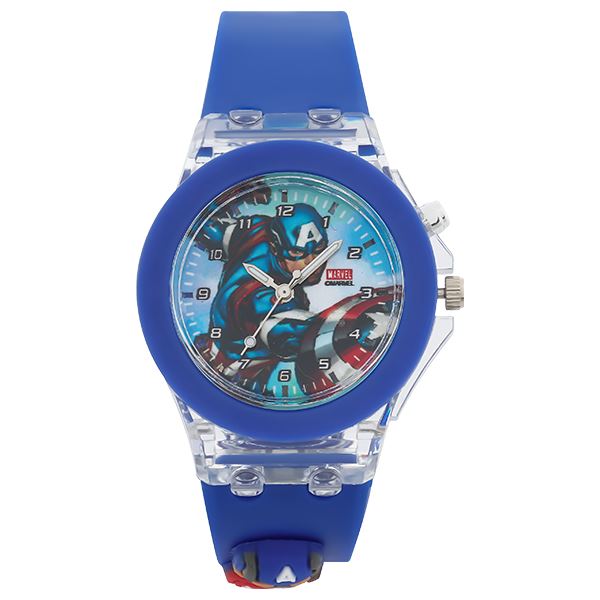 - Mặt đồng hồ bé trai được in họa tiết nhân vật Captain America kết hợp khung viền và dây đeo màu xanh dương tạo nét năng động, mạnh mẽ dành cho các bé yêu thích các siêu anh hùng. Trên dây đeo còn được dán họa tiết nhân vật thêm nét sinh động, nổi bật khi bé sử dụng.
