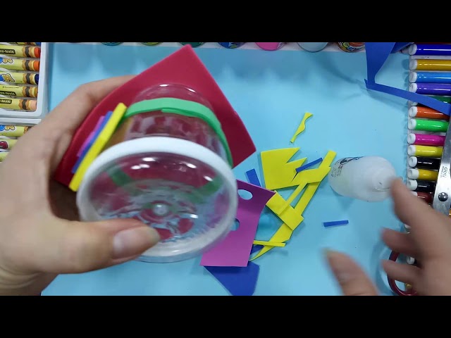- Cuối cùng, mẹ cắt 1 dải xốp màu vàng dài khoảng 2cm rồi gắn ở 2 đầu đáy chai để tạo quai xách là quá trình làm đồ chơi bằng chai nhựa đã hoàn tất.