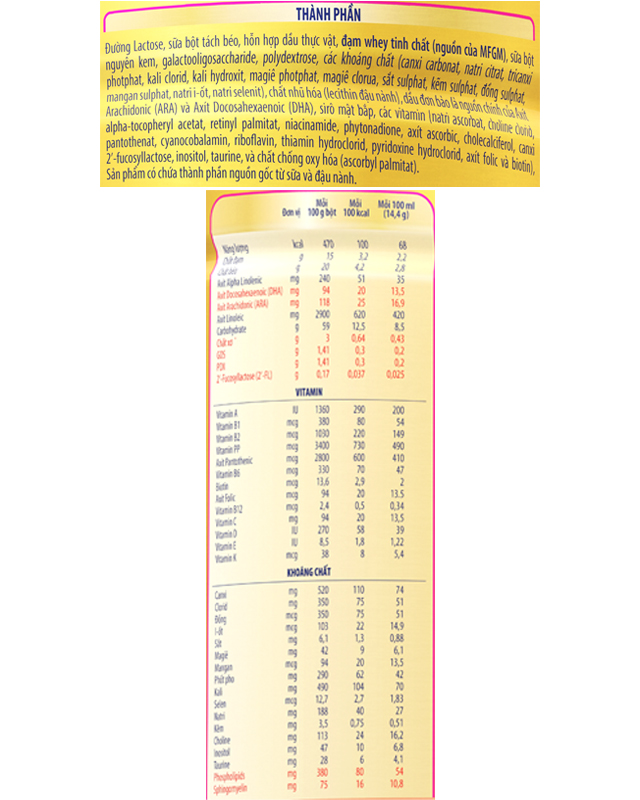 Sữa bột chứa MFGM & 2'-FL HMO kết hợp cùng vitamin, khoáng chất giúp cơ thể trẻ luôn có đủ dưỡng chất, tạo điều kiện cho hệ tiêu hoá của bé phát triển, tăng cường sức đề kháng và hệ miễn dịch, bé khỏe mạnh khôn lớn.