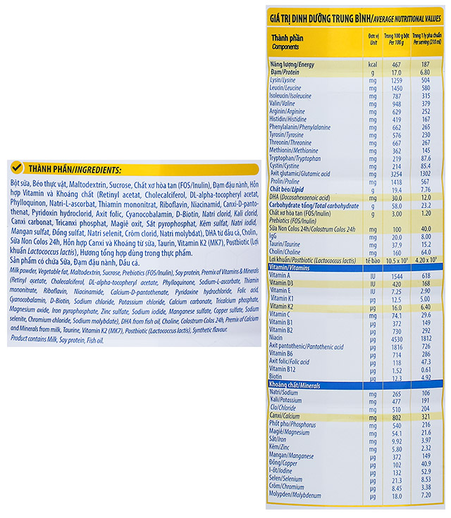 - Bên cạnh đó, thành phần sữa non 24h được nhập khẩu từ Mỹ giàu kháng thể IgG, khi kết hợp cùng chất xơ hòa tan FOS hỗ trợ tăng cường lợi khuẩn, ngăn tình trạng táo bón cho bé ăn ngon, tiêu hóa tốt.