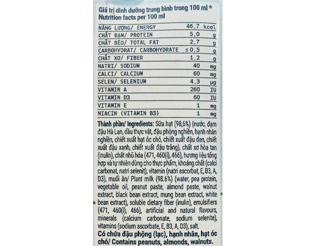 - Mỗi hộp sữa hạt cung cấp mức năng lượng khoảng 46.7 kcal/100 ml, đồng thời bổ sung thêm nhiều loại vitamin và khoáng chất cần thiết, giúp tăng cường sức khỏe tổng thể và cải thiện đề kháng.