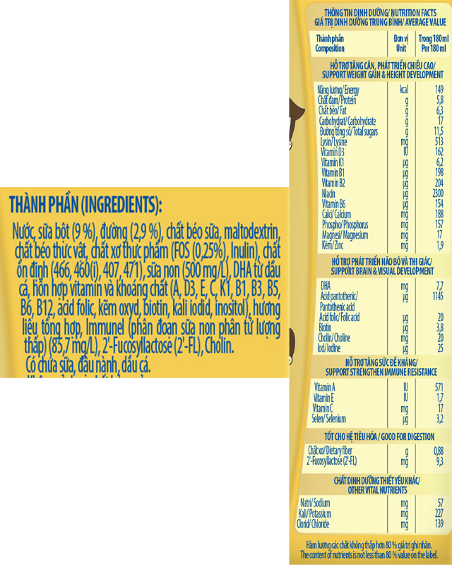 - Sữa pha sẵn chứa dưỡng chất DHA có chiết xuất từ dầu cá, kết hợp với choline, i-ốt hỗ trợ quá trình phát triển về não bộ và thị giác của bé.