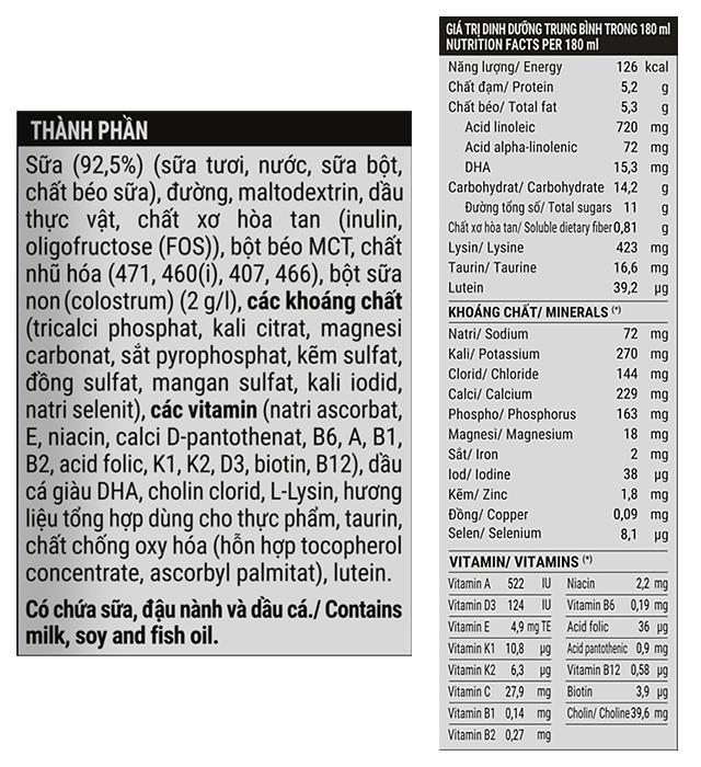 - Bộ dưỡng chất chuyên biệt gồm DHA, axit linoleic, axit α-linolenic, choline, taurine và lutein giúp phát triển não bộ, cải thiện khả năng nhận thức, ghi nhớ và thị giác của trẻ.