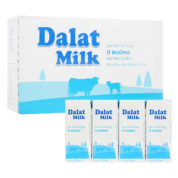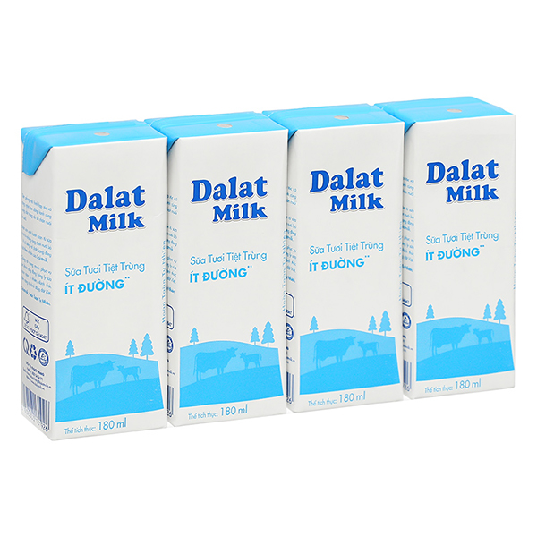 Lốc 4 hộp sữa tươi tiệt trùng Dalat Milk ít đường 180 ml (từ 1 tuổi)