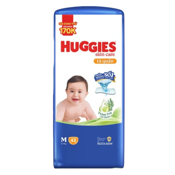 Tã quần Huggies Skincare bổ sung tinh chất tràm trà tạo hương thơm dịu nhẹ, có khả năng khử mùi tốt, giúp làm giảm tình trạng hăm da, bảo vệ làn da của bé mịn màng và ba mẹ thêm yên tâm khi cho con mặc bỉm cả ngày.